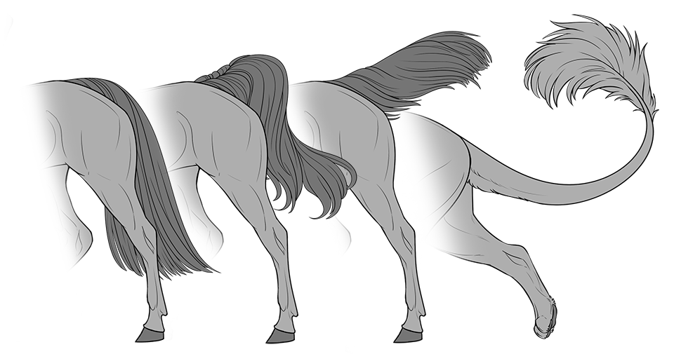 Equines have horselike tail with long hair, and Felines Tail type 1 have longer hair tufts. These tails can mimic the centaurs hair color, and hair coloring rules apply to these tails as well.